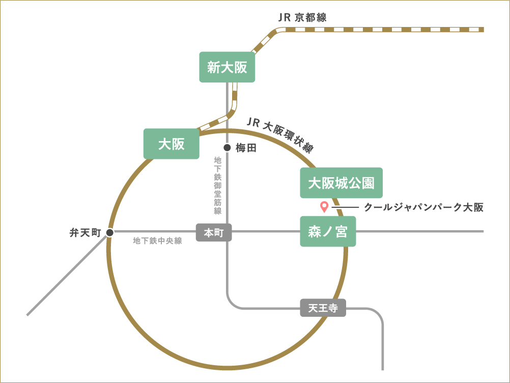 森ノ宮駅の北口改札を出て、徒歩約7分でクールジャパンパーク大阪に到着します。